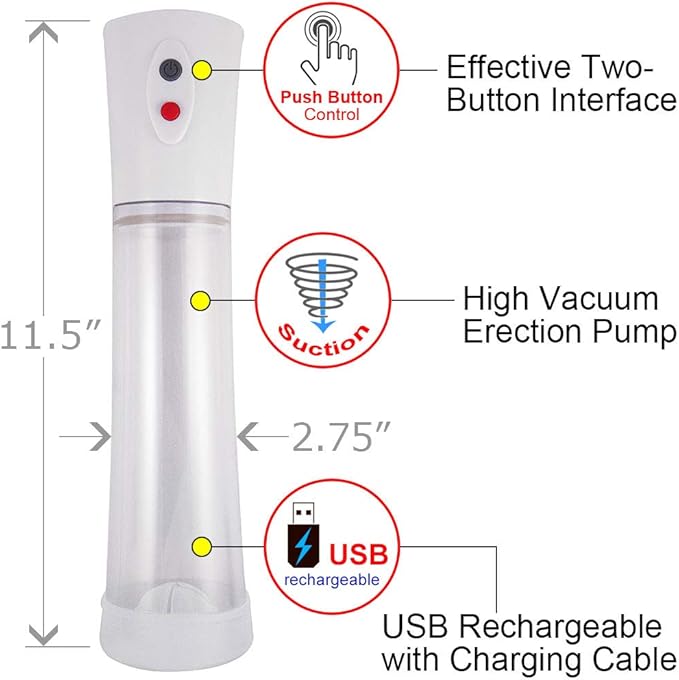 Bomba eléctrica de alto vacío. 3 tamaños de manguito para un ajuste perfecto. Cilindro extragrande para un aumento máximo. Libre de ftalatos. Cumple con la normativa RoHS. Material: silicona, AS, ABS, PVC. Tamaño de la bomba: largo 29,5 cm, diámetro 7 cm, circunferencia 22,5 cm. Tres tamaños de manguito (diámetro interior de la abertura): pequeño 2,9 cm, mediano 3,5 cm, grande 3,8 cm. Longitud del cable: 130 cm. Cable USB incluido. Recargable sin pilas. Tiempo de carga: hasta 1 hora.